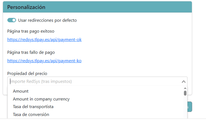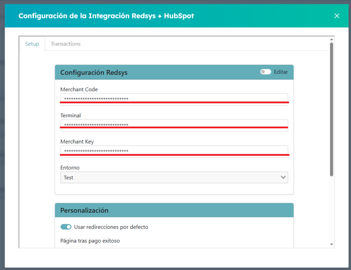 Tras el apartado de configuración del entorno de comercio, habrá otro donde se podrá personalizar la dirección a la que será redirigida el usuario una vez termine la operación, ya sea exitosa o fallida. La aplicación de “Redsys + HubSpot” ofrece una opción por defecto.
