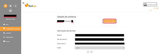 Estos datos los proporcionará al contratar la pasarela de pago o estarán en el entorno del comercio. Para obtener la clave de firma, entrar en configuración del comercio,pulsar el botón de “Ver clave de firma”, introducir las credenciales en la ventana que aparece, y habrá un tiempo limitado en el que se podrá ver la clave.